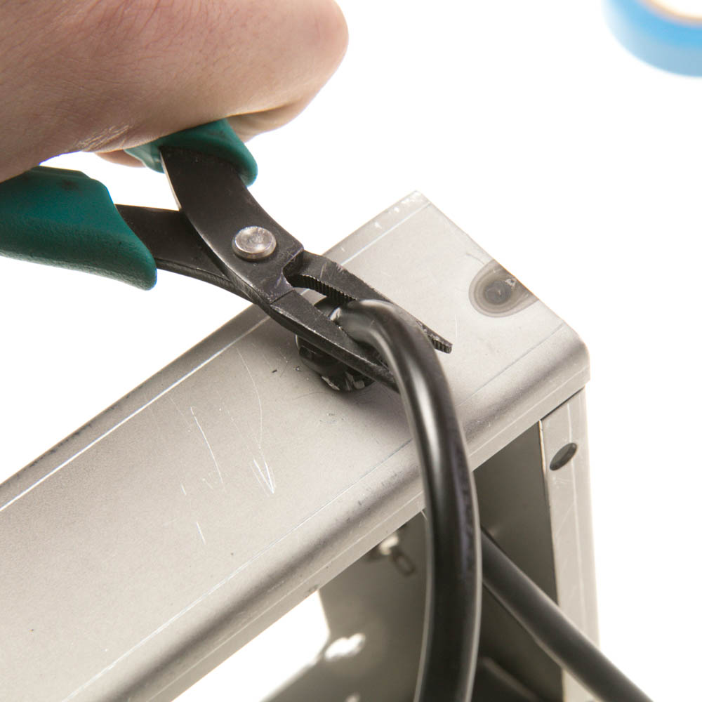 Position the needle-nose pliers over the strain relief as shown. Do not squeeze or damage the wire with the pliers.