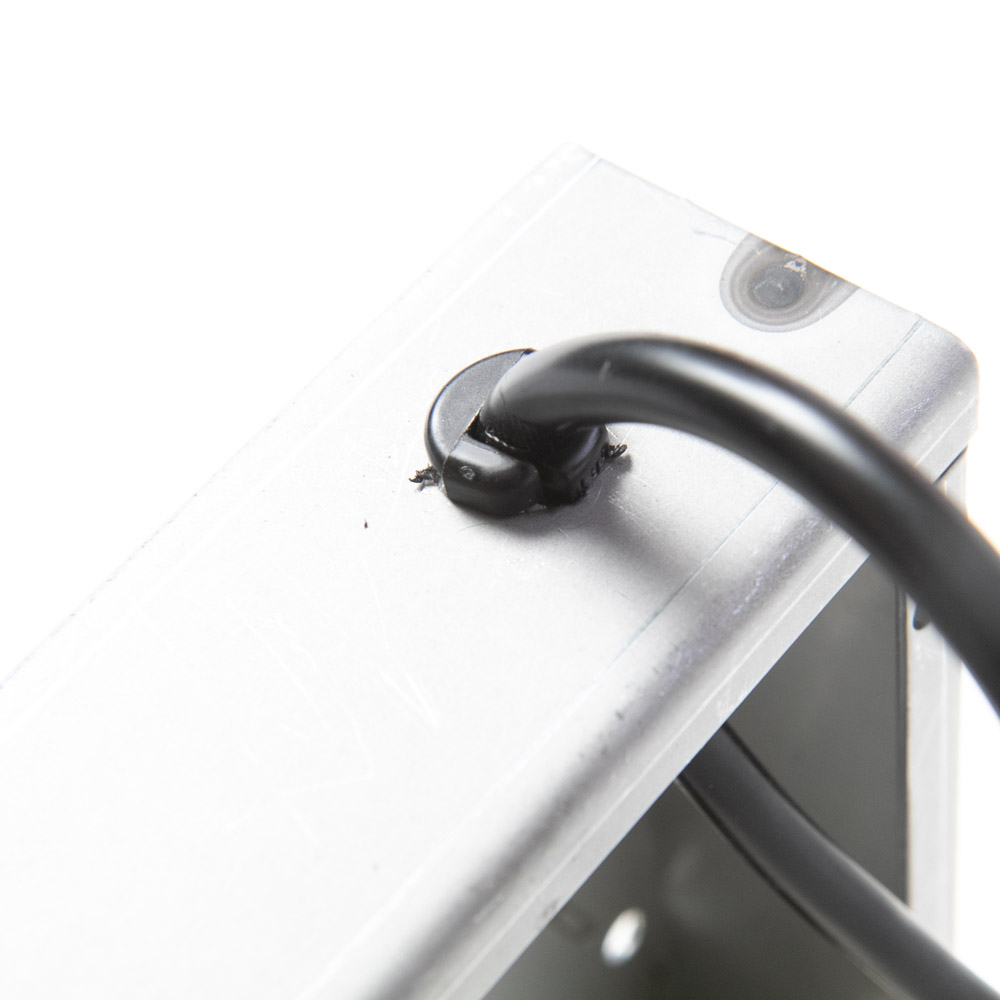 Guide the strain relief into the mounting hole with the U-shaped section first. This allows the chassis hole to keep the strain relief in shape, preventing it from spreading sideways when inserting the smaller part. Use needle-nose pliers to help guide the strain relief into place.