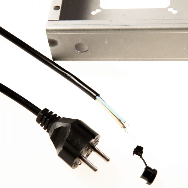 Bend the power cord into a sharp angle where the strain relief will be placed. Plan ahead for how much of the cable needs to be stripped for internal wiring. Removing the connector afterward or stripping the wire while installed can be challenging.