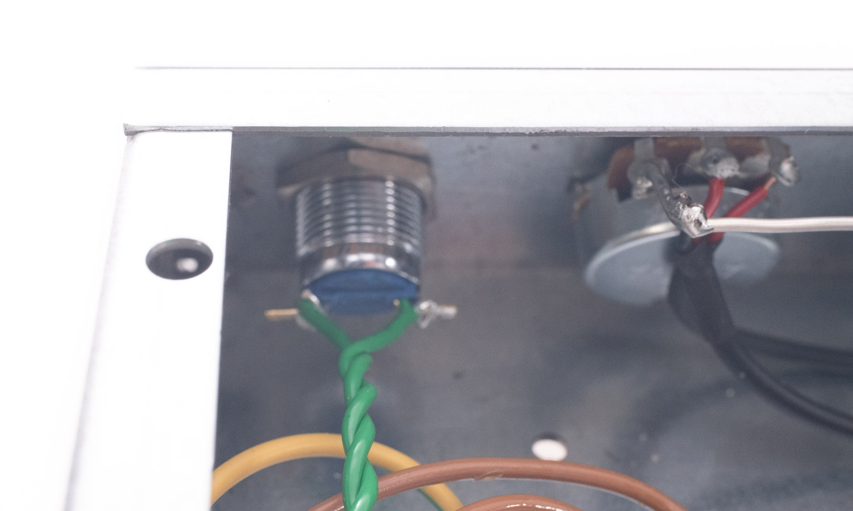 Crimp and solder an M4 ring terminal to the ground wire of the power cable (green-yellow). The length of this wire should be set so that it is the last to detach if the strain relief fails and the cable is pulled out. In the image, the wire has not been shortened yet. Attach the ring terminal with an M4 screw, star washer, and nut, ensuring the star washer is placed between the ring terminal and the chassis.