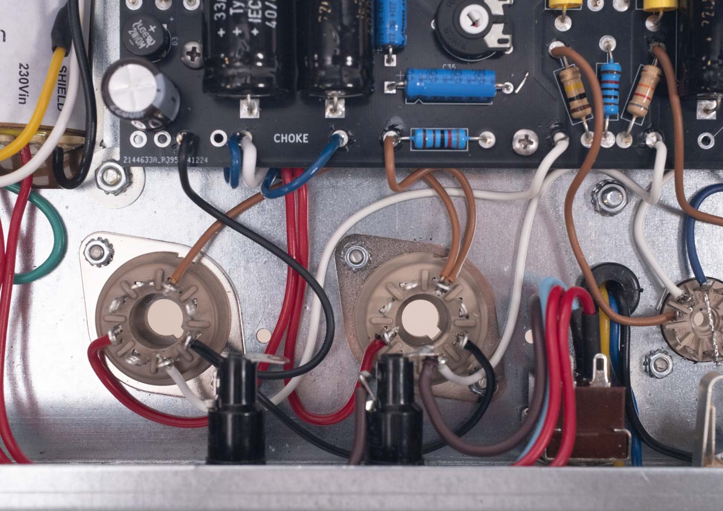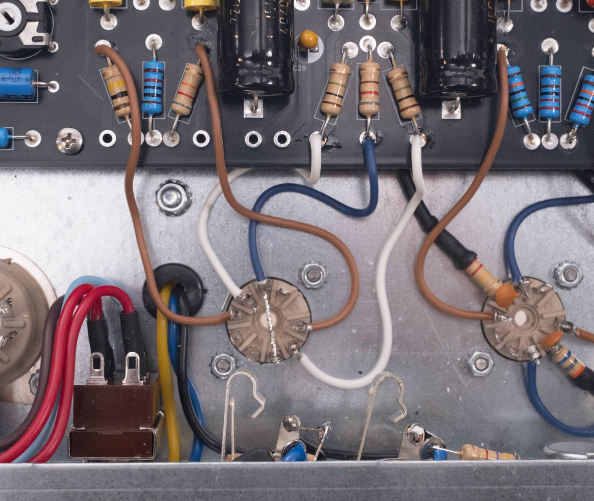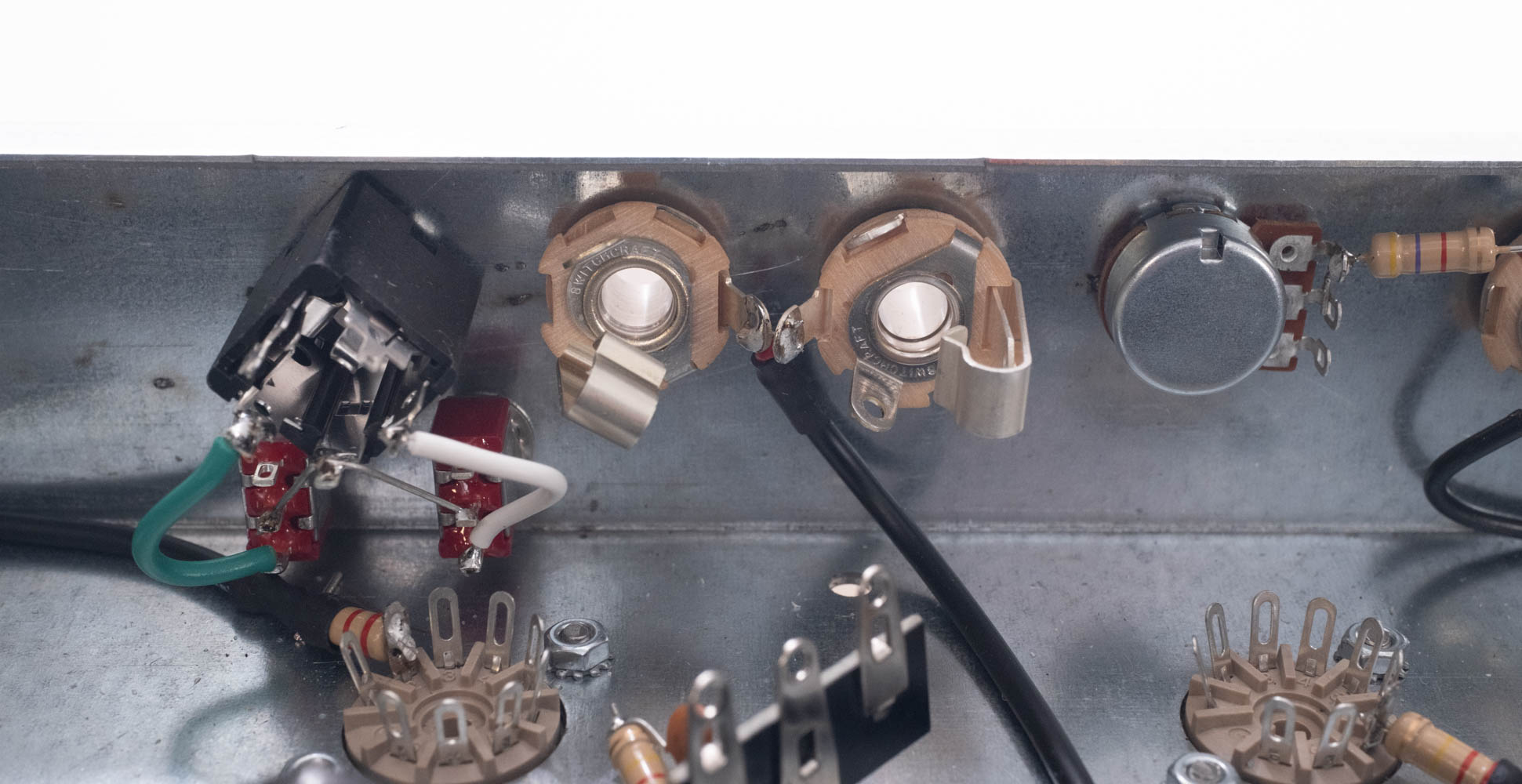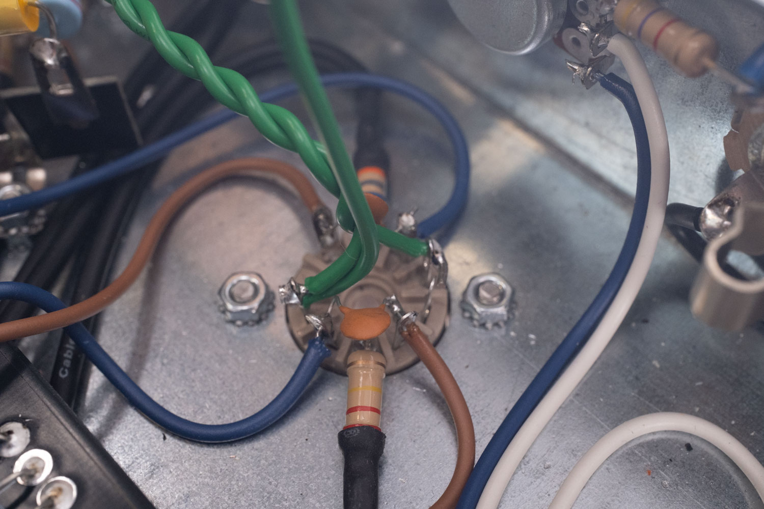 Note: The green wire shown in the image has been repurposed from a transformer wire. In the layout diagram, this wire is yellow. Do not use a single-stranded green wire here. This type of wire is only used for tube heater wiring.