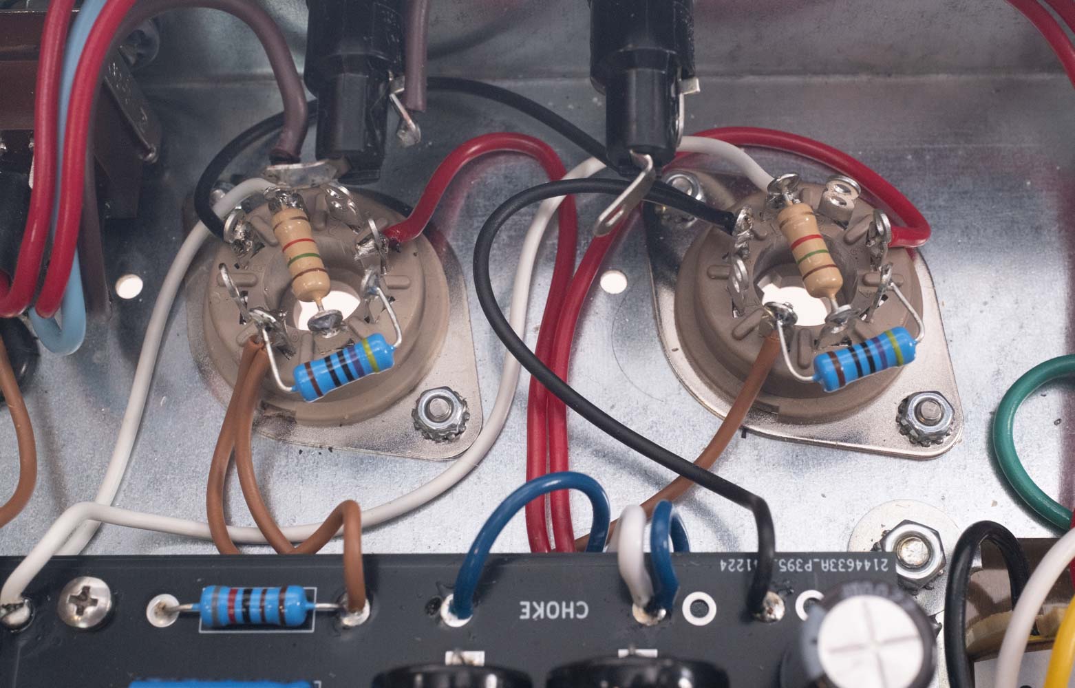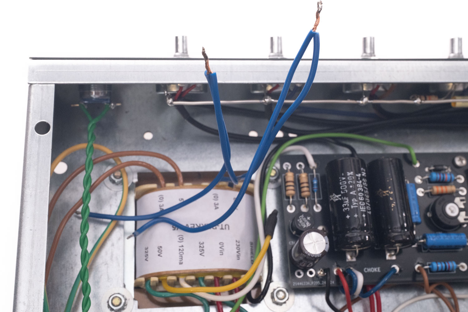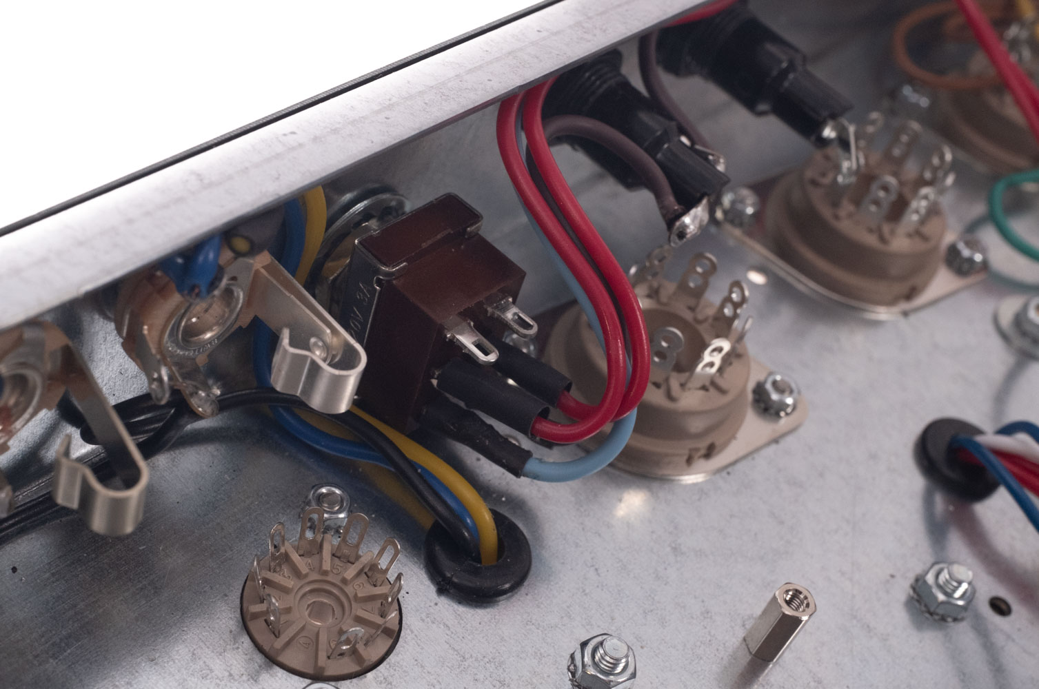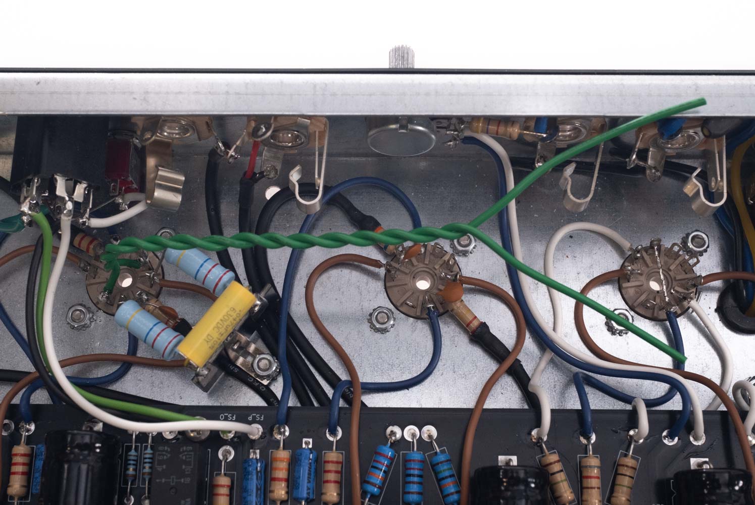 Note: The green wire shown in the image has been repurposed from a transformer wire. In the layout diagram, this wire is yellow. Do not use a single-stranded green wire here. This type of wire is only used for tube heater wiring.