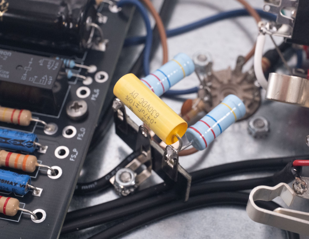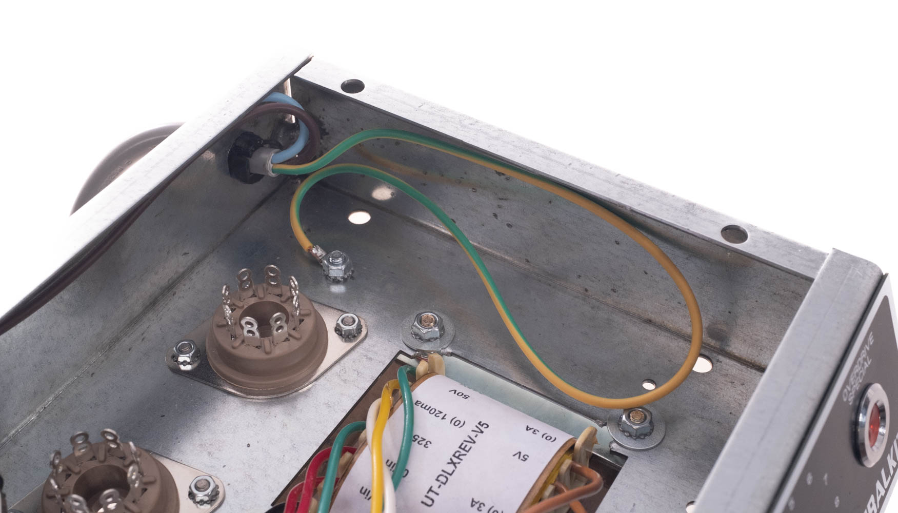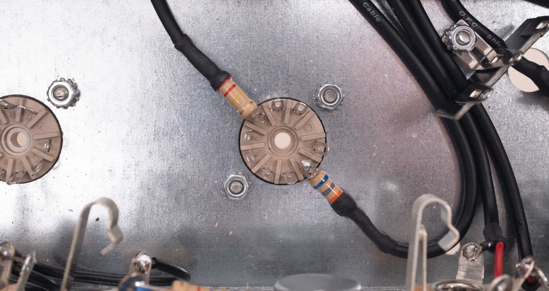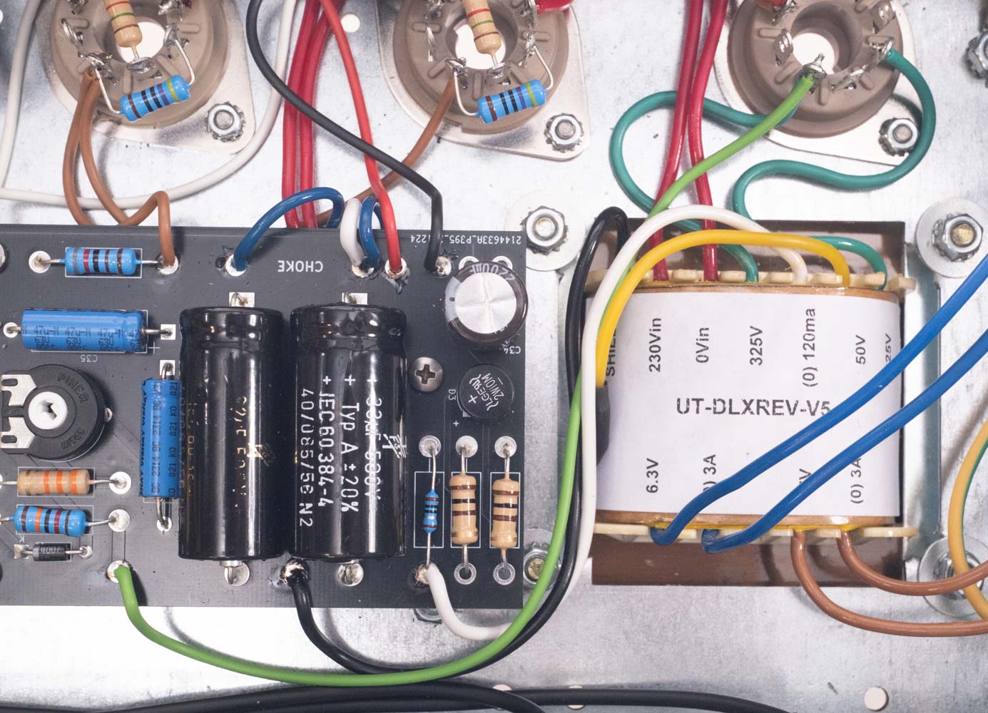 Note: The green wire shown in the image has been repurposed from a transformer wire. In the layout diagram, this wire is yellow. Do not use a single-stranded green wire here. This type of wire is only used for tube heater wiring.