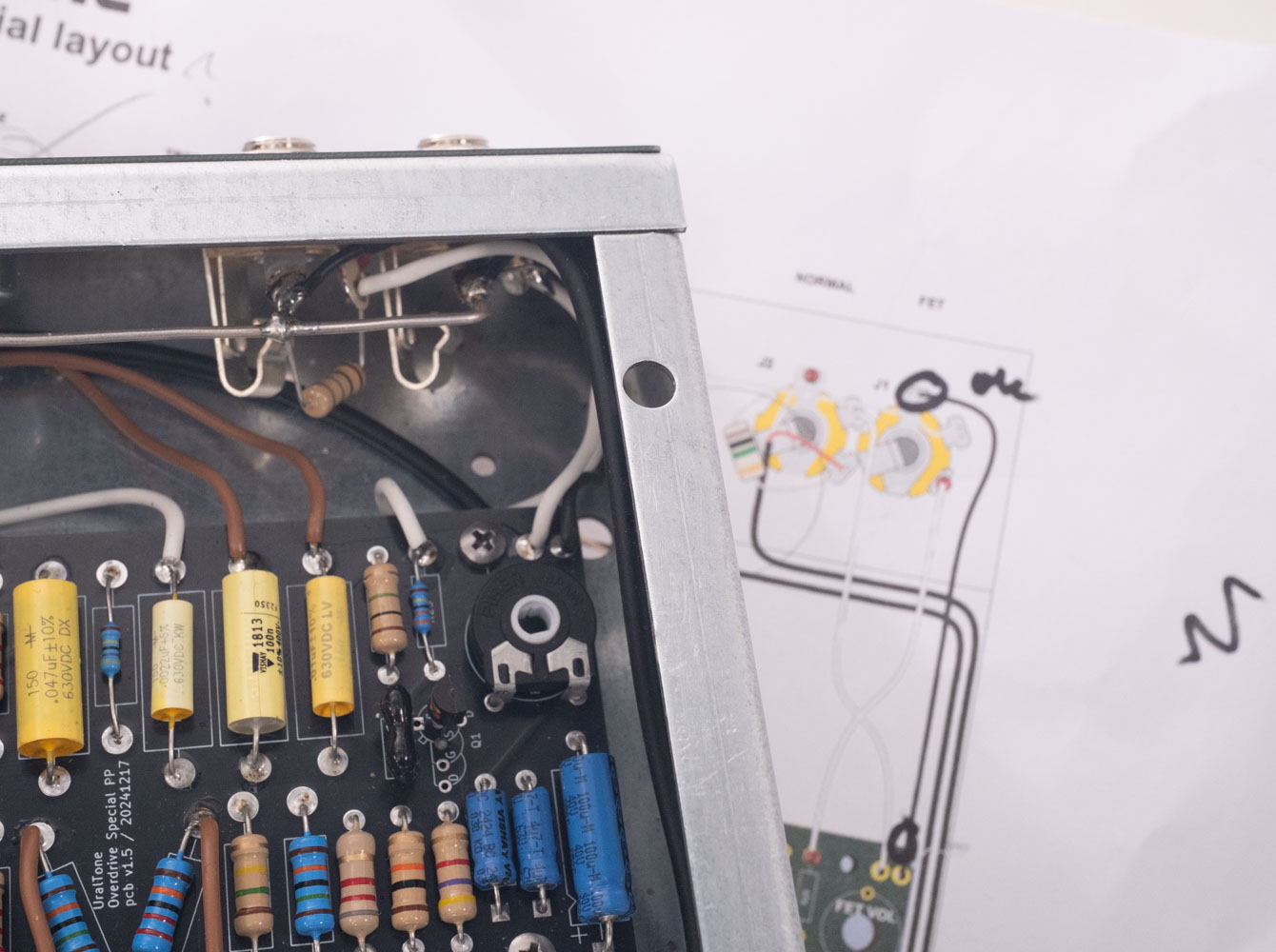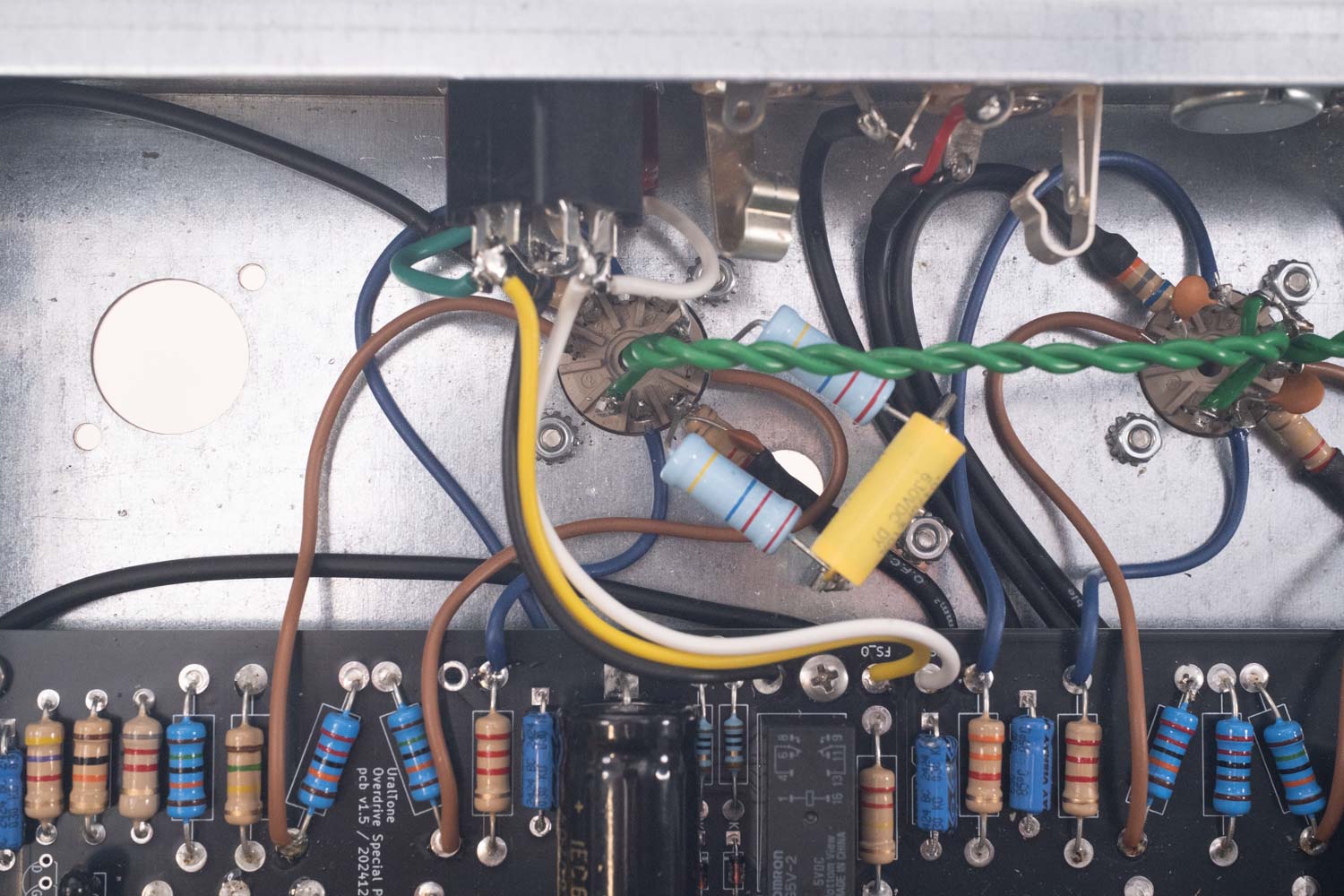 The tested ODS is now ready for playing. Connect a speaker and guitar, and turn up the volume. Note that the volume control is distributed across multiple points, and the overdrive might be engaged, meaning there are several gain stages affecting the signal. The FET input and overdrive trimmers on the board may be set to zero, muting the amplifier. The easiest starting point is to use the normal input, bypass the overdrive from the rear panel switch, and adjust the trimmers once the amp produces sound.