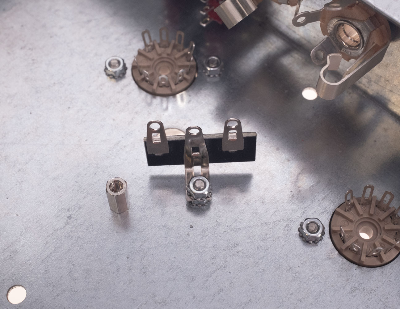 The amplifier assembly consists of three main phases: installing and wiring the chassis-mounted components, assembling and soldering the circuit board, and installing and wiring the circuit board to the chassis. We recommend following the assembly order shown in the images below. This makes the build process easier and avoids soldering in difficult or tight spaces.