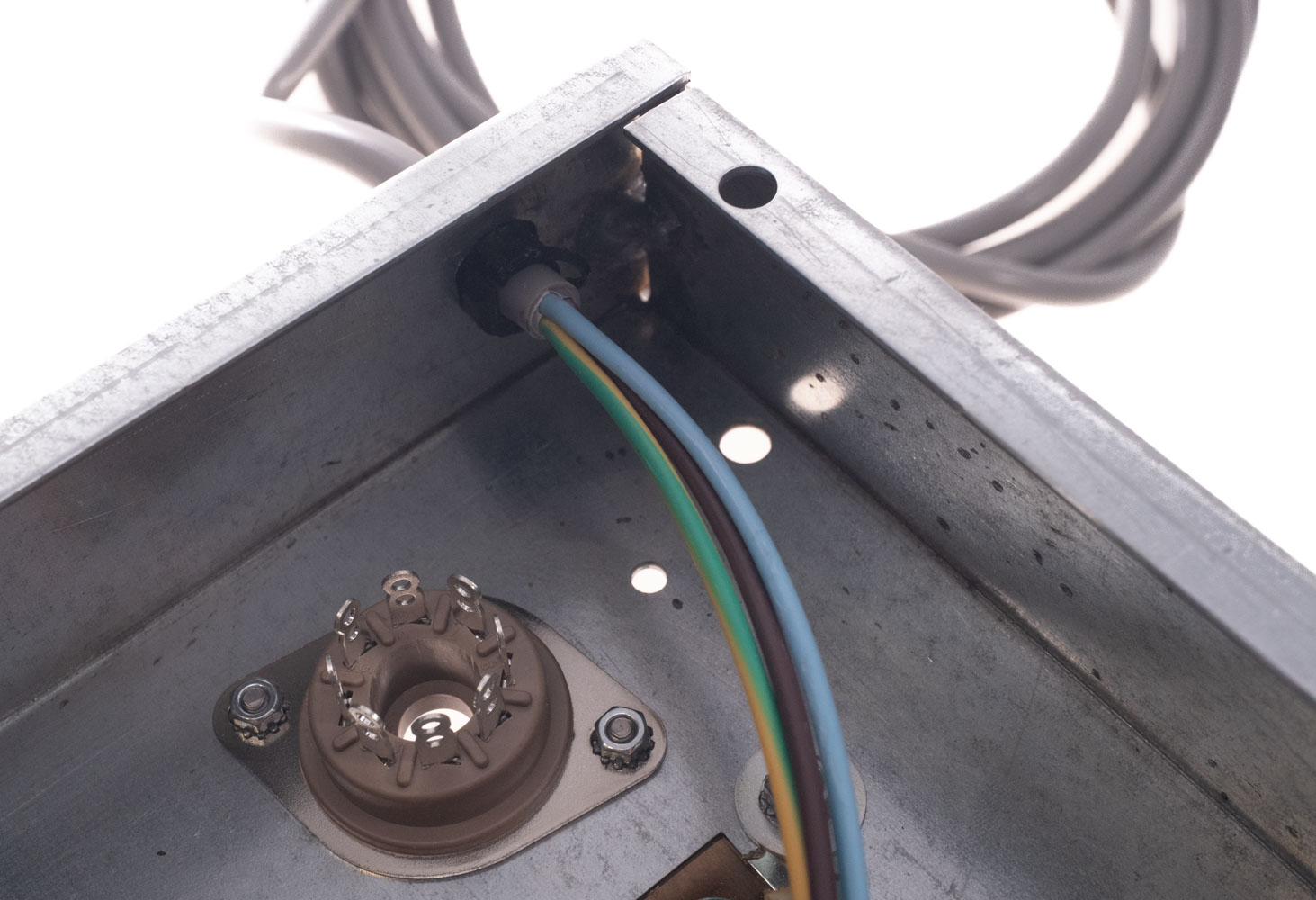 Install the mains cable on the rear panel. Strip about 30cm of the outer sheath from the supplied power cable. Instructions for shortening and installing the power cable into the panel can be found at: