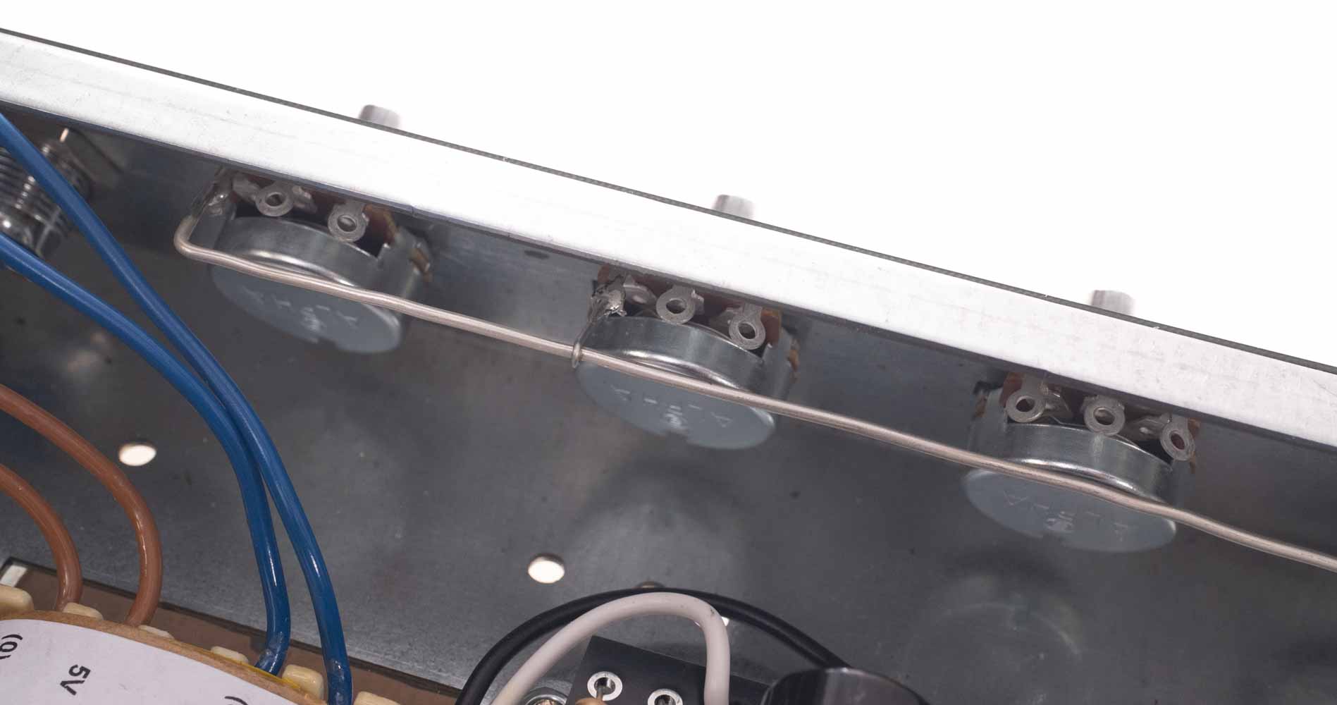 To simplify soldering, a dedicated grounding wire runs behind the front panel potentiometers. This wire should be installed approximately one centimeter away from the potentiometer solder lugs. One end of the wire is soldered to the ground lug of the FET input jack.