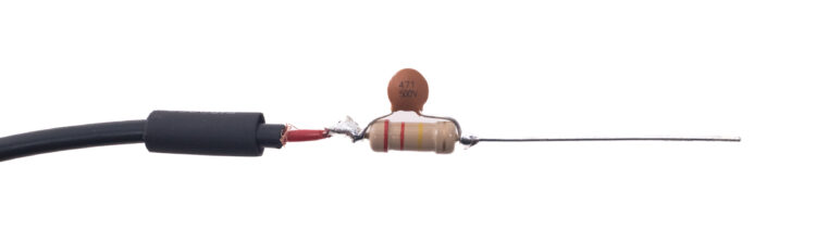 Solder the 0.6W metal film resistors onto the circuit board. Resistors do not have a required installation direction, but they can be aligned for easy reading, so the color bands are consistently oriented.