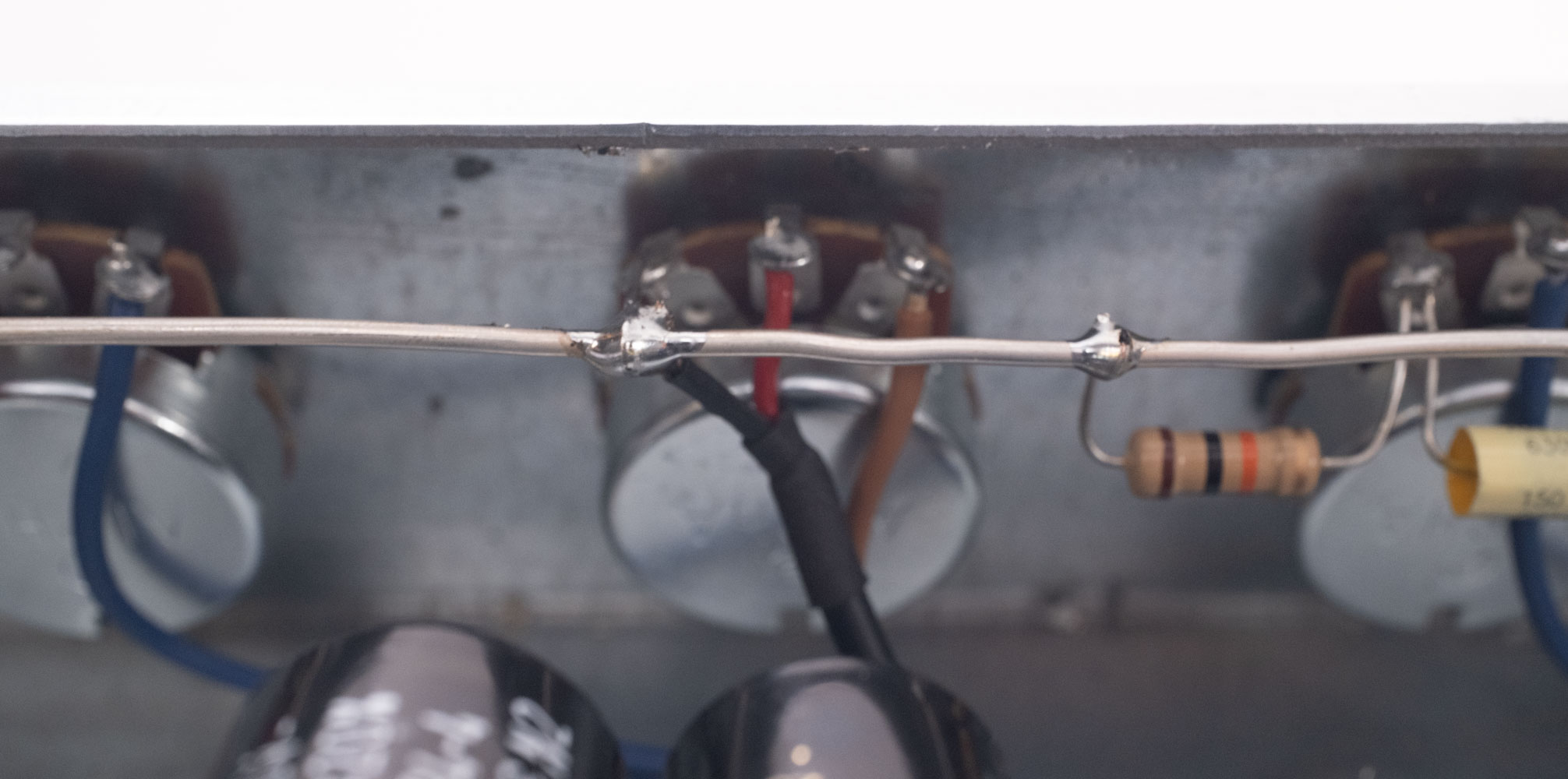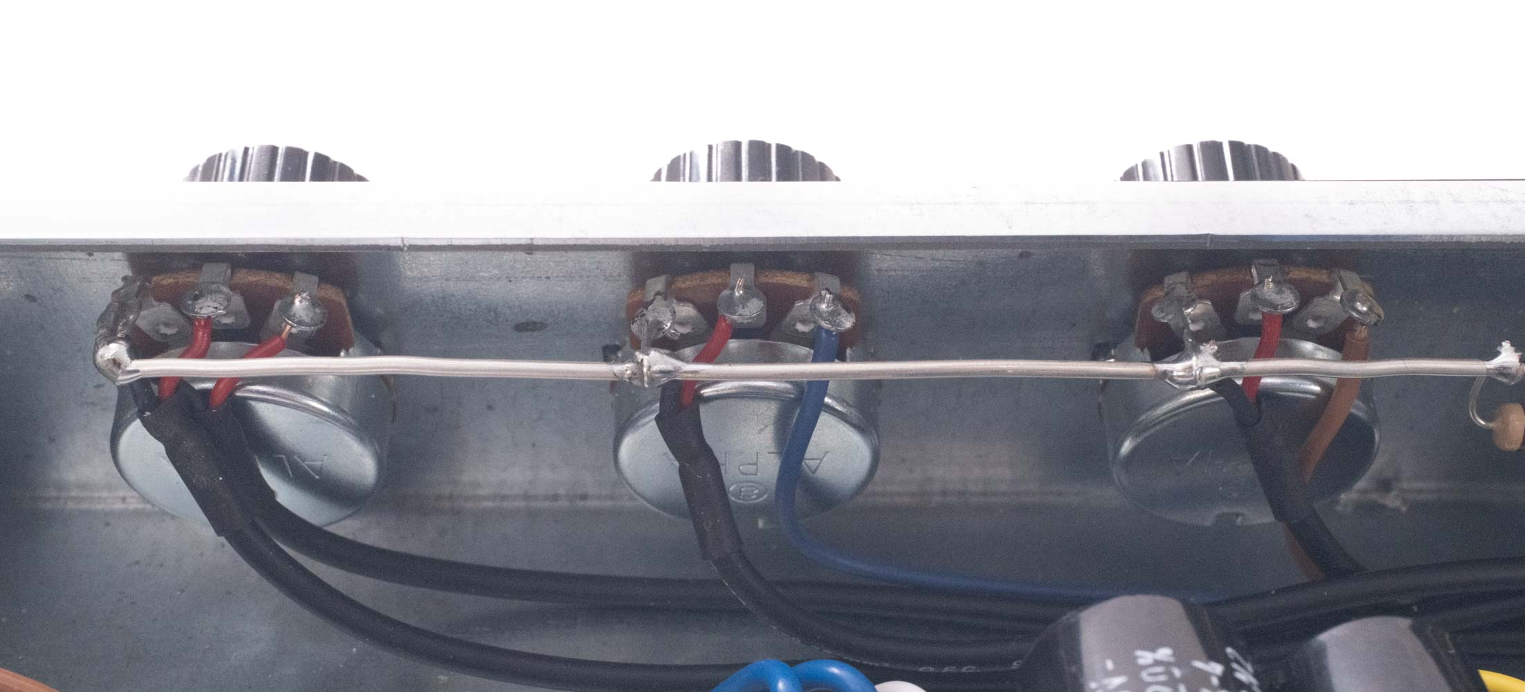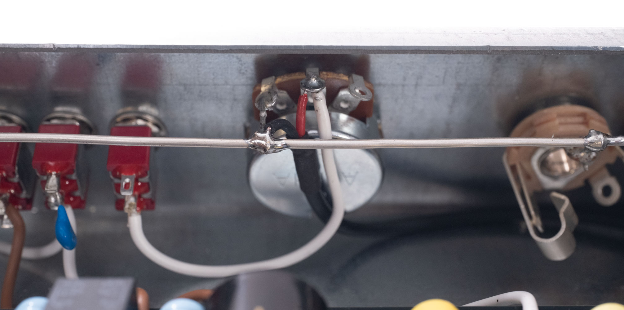 Wrap the wire around the ground bus bar and solder it in place. Four ground connections are soldered to the potentiometers and one to the normal jack.