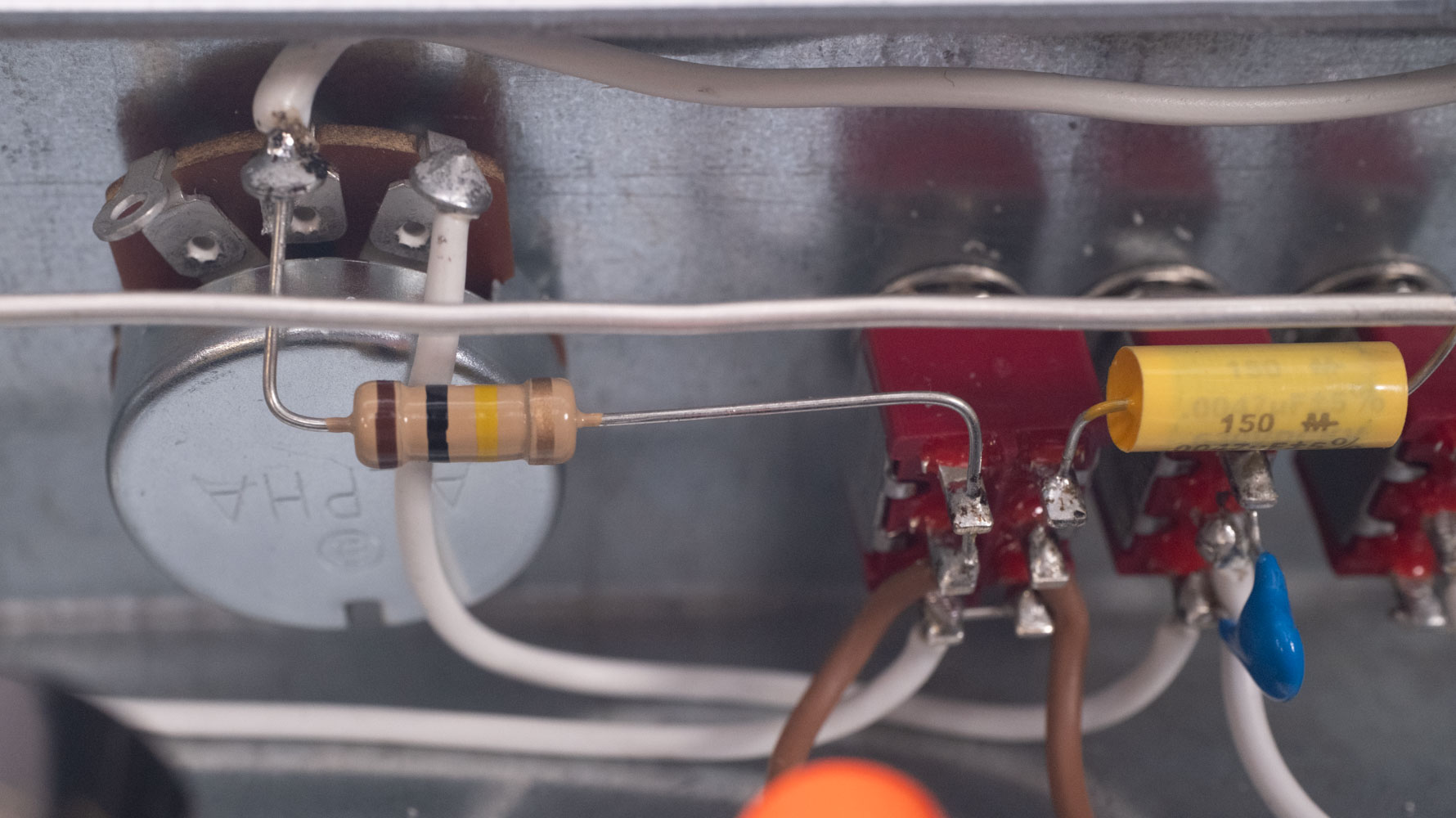Solder a 10cm wire to the center solder lug of the front panel's two-position "Deep" SPDT switch. Insert a 390pF capacitor into the outermost solder lugs and solder one end in place. On the other end, insert a 10cm white wire and solder both the capacitor and the wire in place.