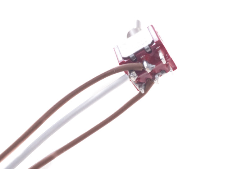 Detail of the same step. Note the heat shrink tubing installed over the switch solder joints for protection.
