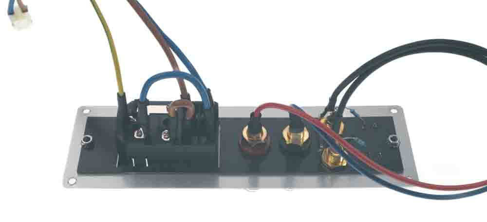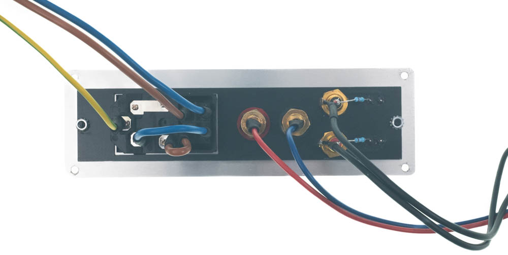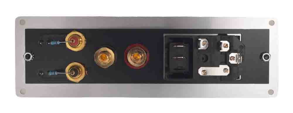 Attach the speaker output banana plugs in place and insert the IEC connector-fuse holder-switch combination in place. M8 ring terminals can be installed under the nuts of the banana plugs if the soldering iron available does not have enough power to solder the wires directly to the connector bodies.