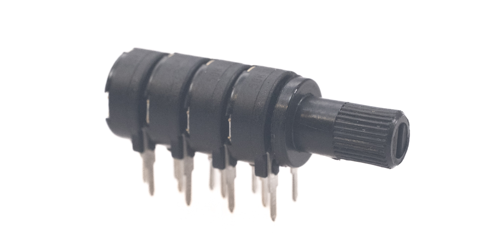 Push the knob/shaft through the first trimmer and turn it counterclockwise if necessary. Then push the knob into the next trimmer and turn the knob again so that this trimmer's position is also turned counterclockwise. If the trimmers are not aligned, remove the last trimmer from the shaft and install it in the same direction as the previous one. Repeat this step as needed depending on the total number of trimmers. The position of the potentiometer shaft's slot does not matter at the beginning of the installation; this can be corrected later. When the trimmer is turned to zero, the slot has rotated 65° counterclockwise from the top position.