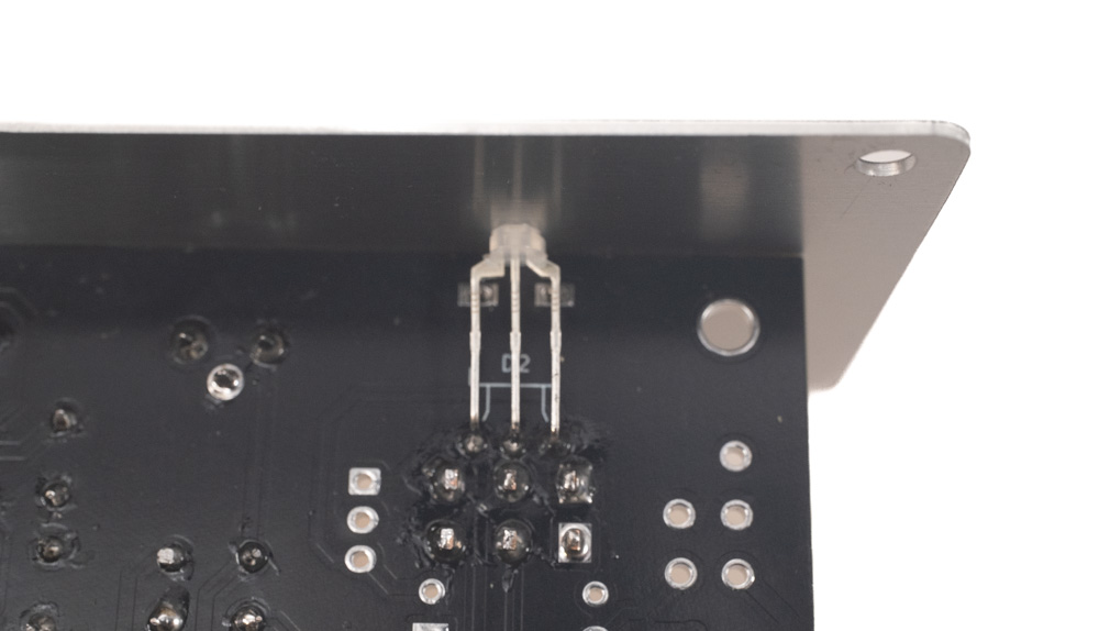Attach the trimmers to the board and ensure that all trimmers on the same axis are aligned and flush with the board surface before soldering them to the board. You can use the device's front panel as an aid in positioning and adjust/correct their position if necessary.