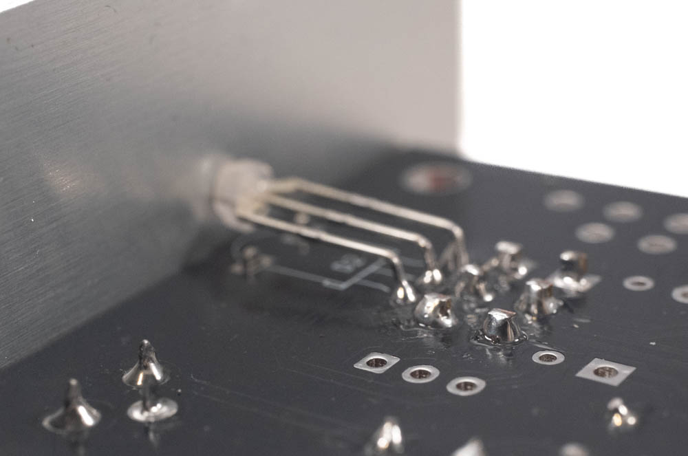 The device's LED is installed on the component side of the circuit board. Bend the LED legs at a 90-degree angle. The bend is made so that the shortest lead of the LED goes to the pad on the right side in the picture. In this task, it is also advisable to use the front panel as an aid to find the correct installation dimensions. Solder the LED from this side of the board.
