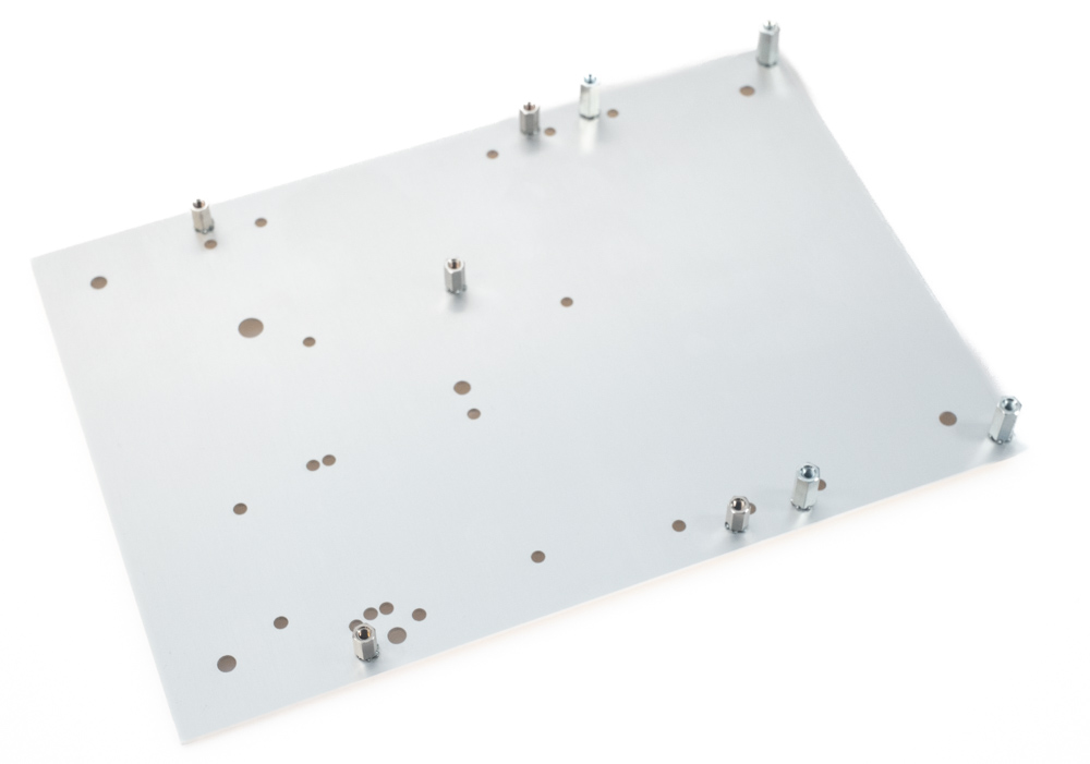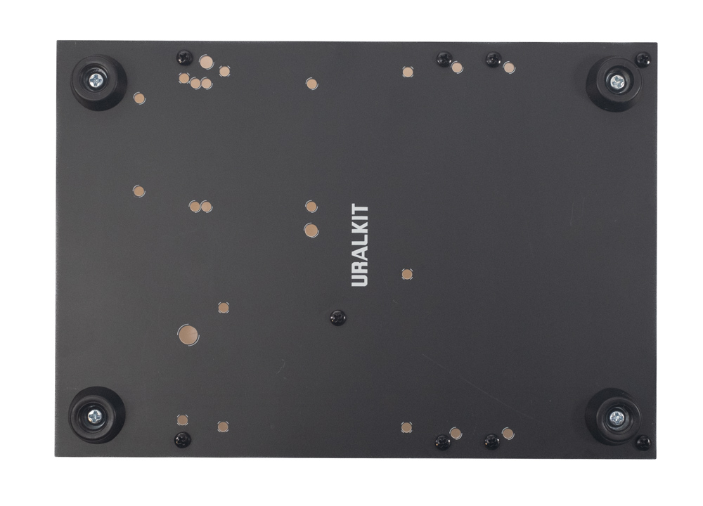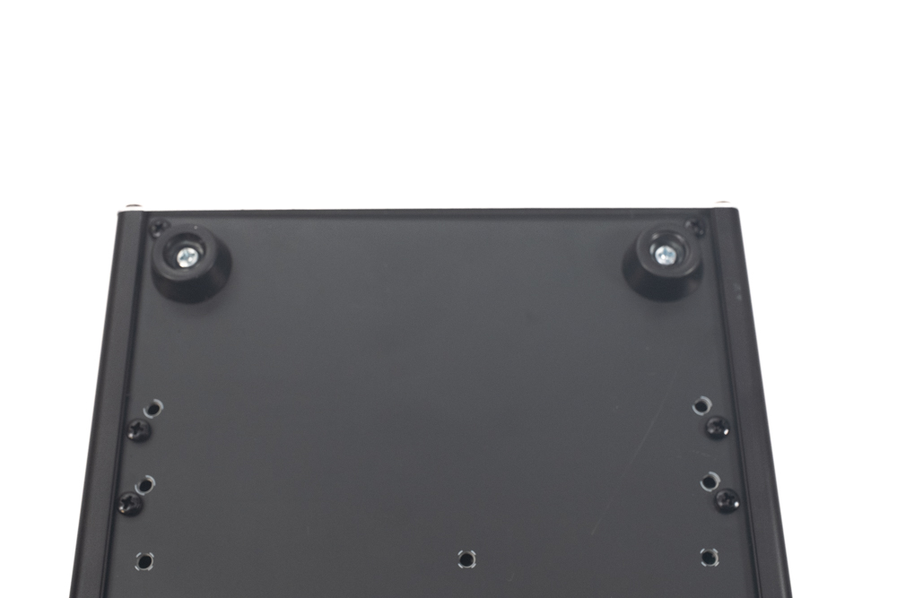 Attach the rubber feet to the corners of the base plate with M4 screws and nuts.