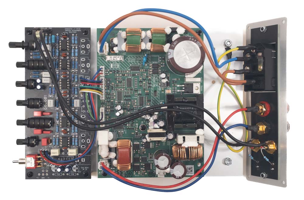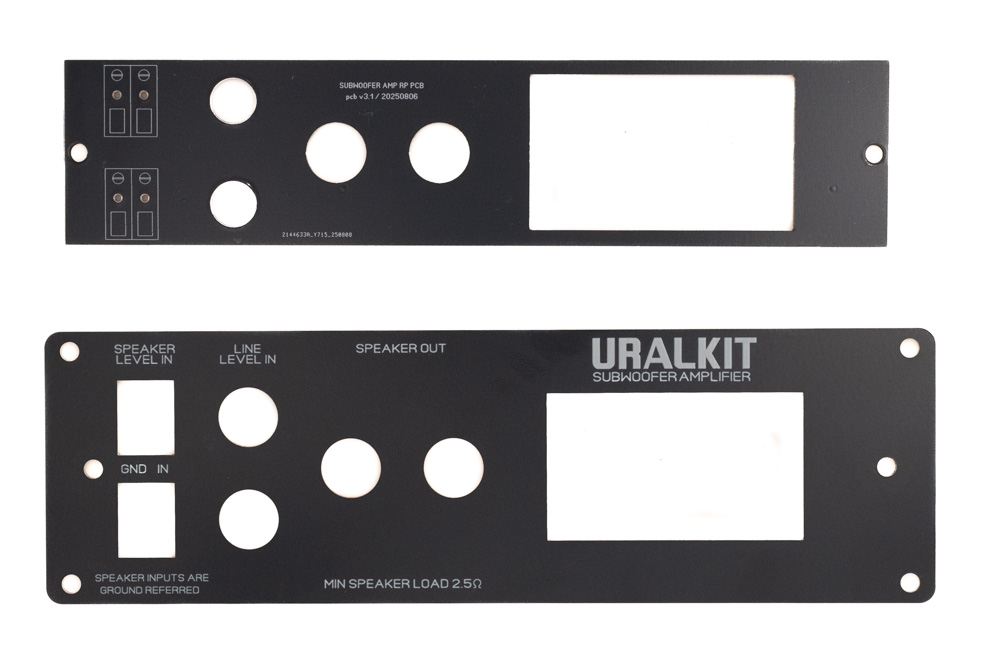 The back panel of the kit uses an auxiliary circuit board to attach the screw terminals of the speaker-level input to the panel. This same board also reinforces the back panel.