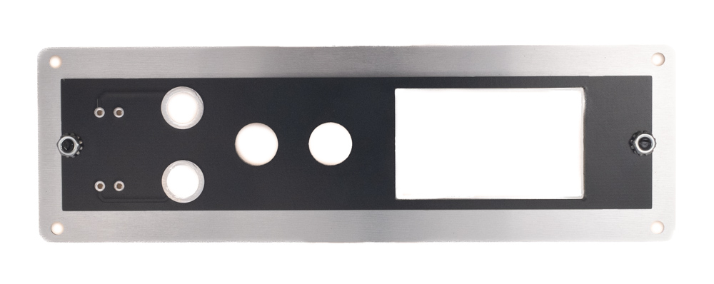 Slide the amplifier into the case. Press the front panel into place and attach it as shown in the picture with two screws on the top side (bottom side in the picture).